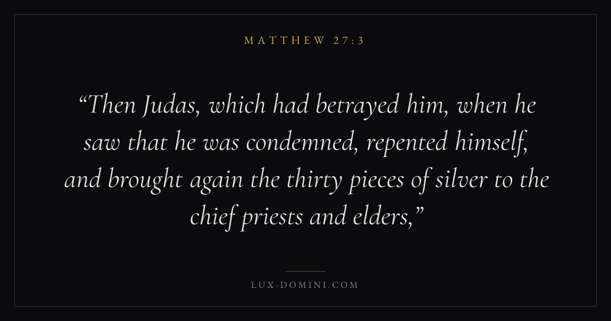 Then Judas, which had betrayed him, when he saw that he was condemned, repented himself, and brought again the thirty pieces of silver to the chief priests and elders,