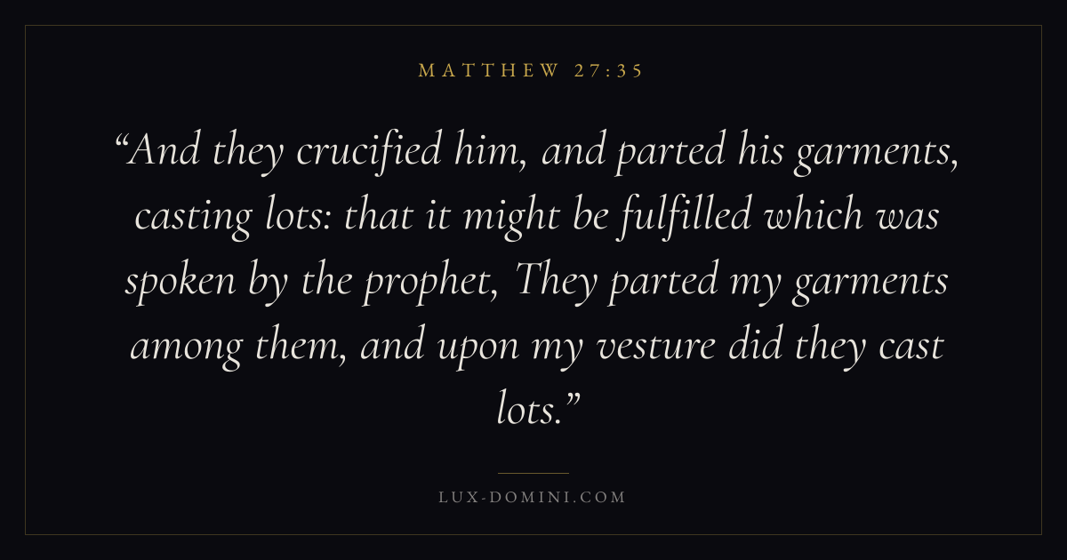 And they crucified him, and parted his garments, casting lots: that it might be fulfilled which was spoken by the prophet, They parted my garments among them, and upon my vesture did they cast lots.