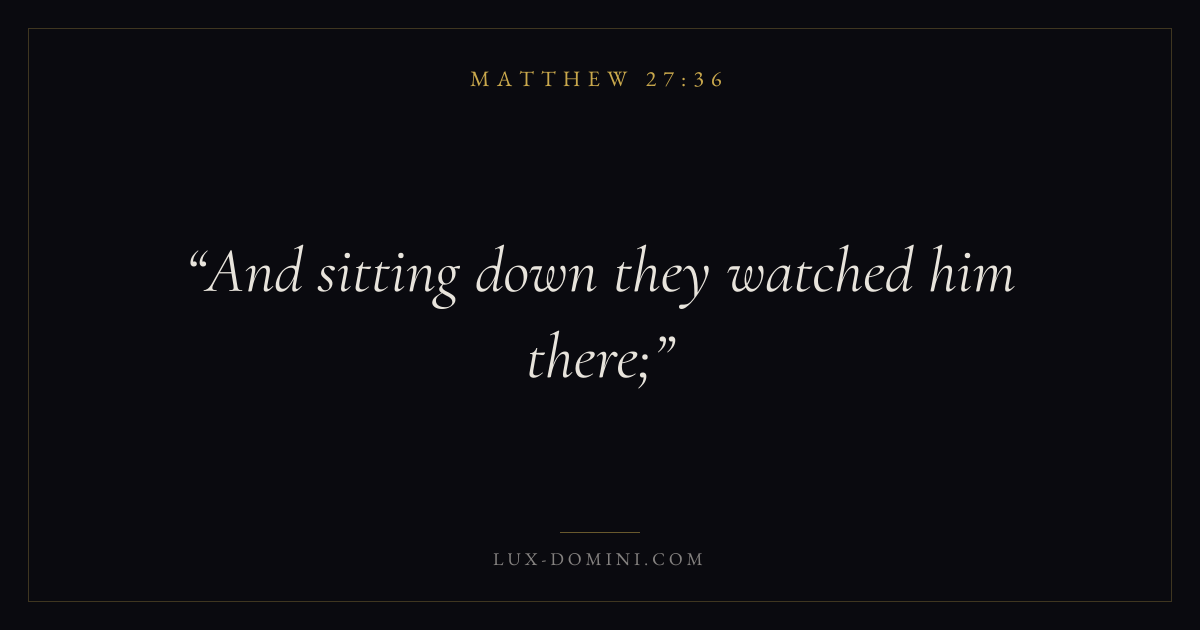 Books / Matthew / Chapter 27 / Verse 36 ← Matthew 27:35 Matthew 27:36 Matthew 27:37 → And sitting down they watched him there; Download verse card Share on Twitter Share on Facebook Pin it ✦ Key themes FulfillmentKingdom of heavenDiscipleshipTeaching Read with Matthew 27:34Matthew 27:35 ✦ Matthew Chapter 27 verses V. 1 V. 2 V. 3 V. 4 V. 5 V. 6 V. 7 V. 8 V. 9 V. 10 V. 11 V. 12 V. 13 V. 14 V. 15 V. 16 V. 17 V. 18 V. 19 V. 20 V. 21 V. 22 V. 23 V. 24 V. 25 V. 26 V. 27 V. 28 V. 29 V. 30 V. 31 V. 32 V. 33 V. 34 V. 35 V. 36 V. 37 V. 38 V. 39 V. 40 V. 41 V. 42 V. 43 V. 44 V. 45 V. 46 V. 47 V. 48 V. 49 V. 50 V. 51 V. 52 V. 53 V. 54 V. 55 V. 56 V. 57 V. 58 V. 59 V. 60 V. 61 V. 62 V. 63 V. 64 V. 65 V. 66