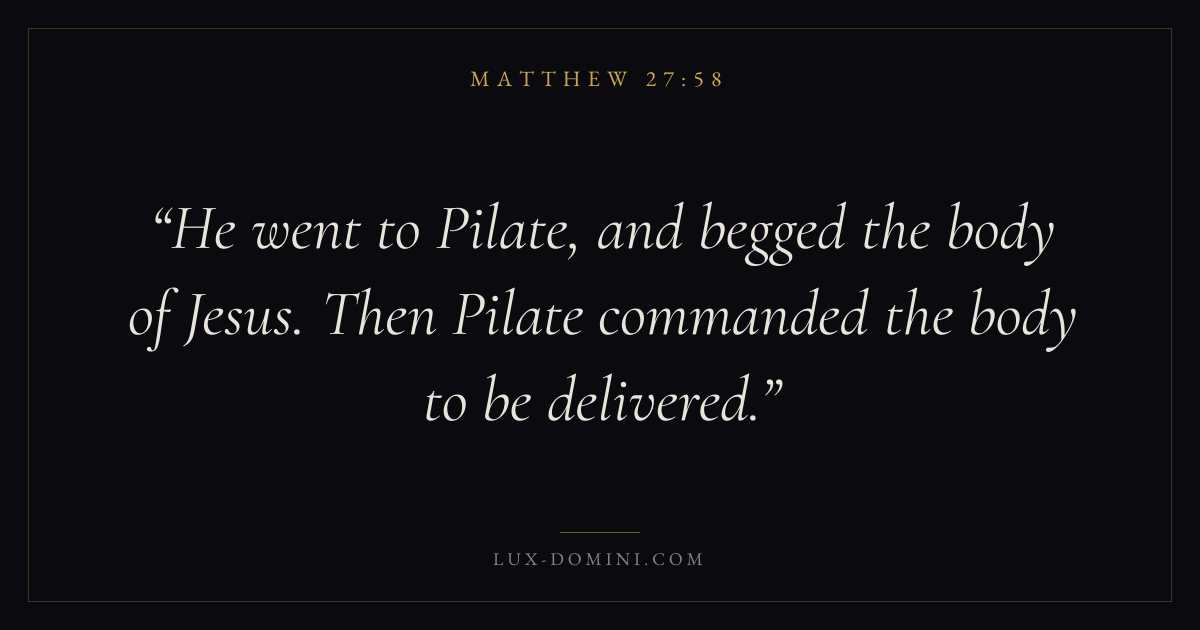 He went to Pilate, and begged the body of Jesus. Then Pilate commanded the body to be delivered.
