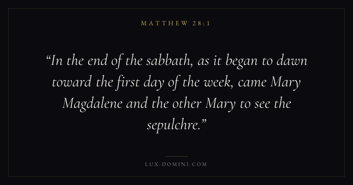 In the end of the sabbath, as it began to dawn toward the first day of the week, came Mary Magdalene and the other Mary to see the sepulchre.