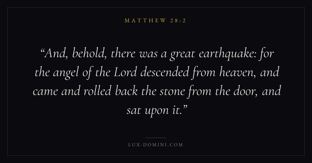 And, behold, there was a great earthquake: for the angel of the Lord descended from heaven, and came and rolled back the stone from the door, and sat upon it.
