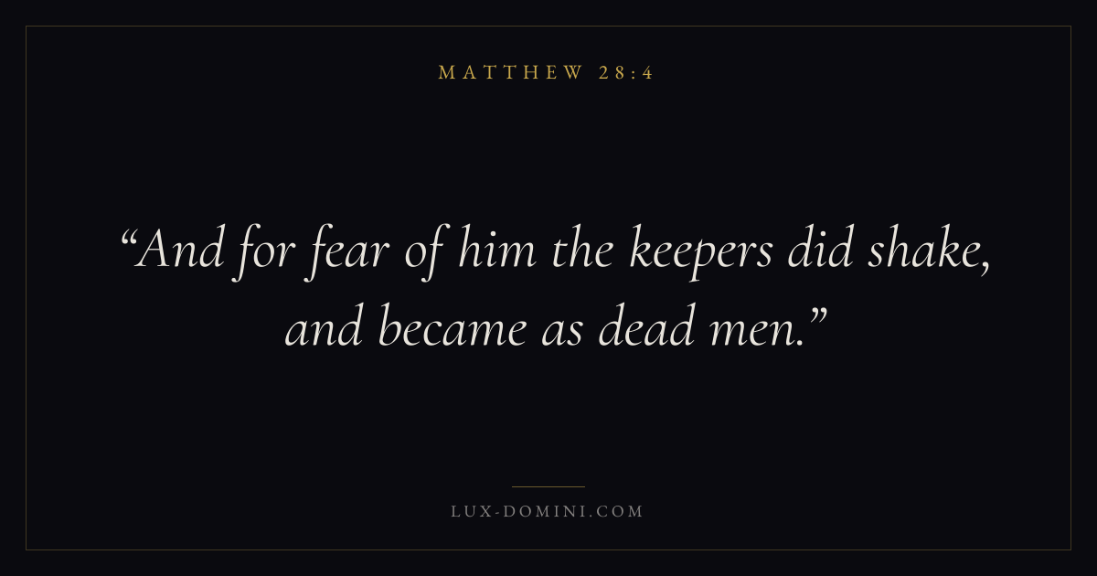 Books / Matthew / Chapter 28 / Verse 4 ← Matthew 28:3 Matthew 28:4 Matthew 28:5 → And for fear of him the keepers did shake, and became as dead men. Download verse card Share on Twitter Share on Facebook Pin it ✦ Key themes Anxiety and fearFulfillmentKingdom of heavenDiscipleship Read with Matthew 28:3Matthew 28:5Philippians 4:6Isaiah 41:10 Related topics Bible verses about anxiety and fear ✦ Matthew Chapter 28 verses V. 1 V. 2 V. 3 V. 4 V. 5 V. 6 V. 7 V. 8 V. 9 V. 10 V. 11 V. 12 V. 13 V. 14 V. 15 V. 16 V. 17 V. 18 V. 19 V. 20