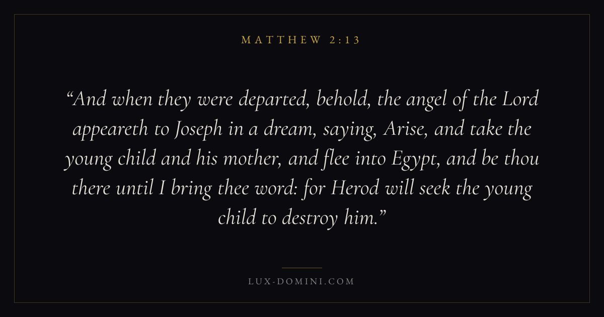And when they were departed, behold, the angel of the Lord appeareth to Joseph in a dream, saying, Arise, and take the young child and his mother, and flee into Egypt, and be thou there until I bring thee word: for Herod will seek the young child to destroy him.