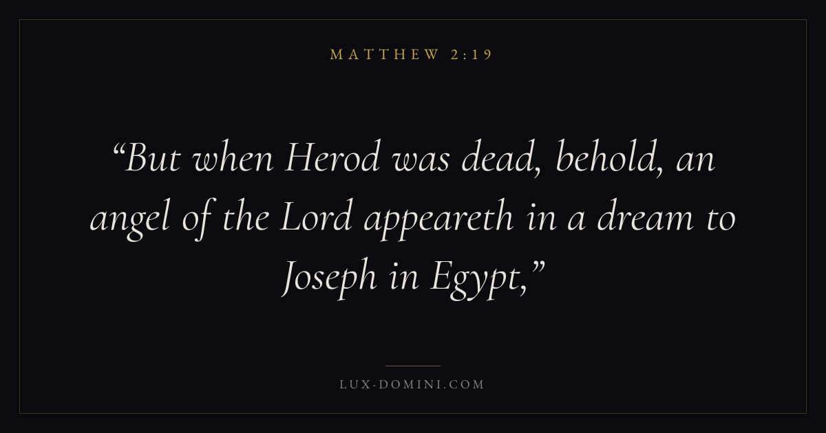 But when Herod was dead, behold, an angel of the Lord appeareth in a dream to Joseph in Egypt,