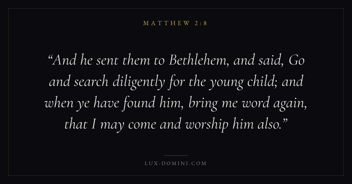 And he sent them to Bethlehem, and said, Go and search diligently for the young child; and when ye have found him, bring me word again, that I may come and worship him also.