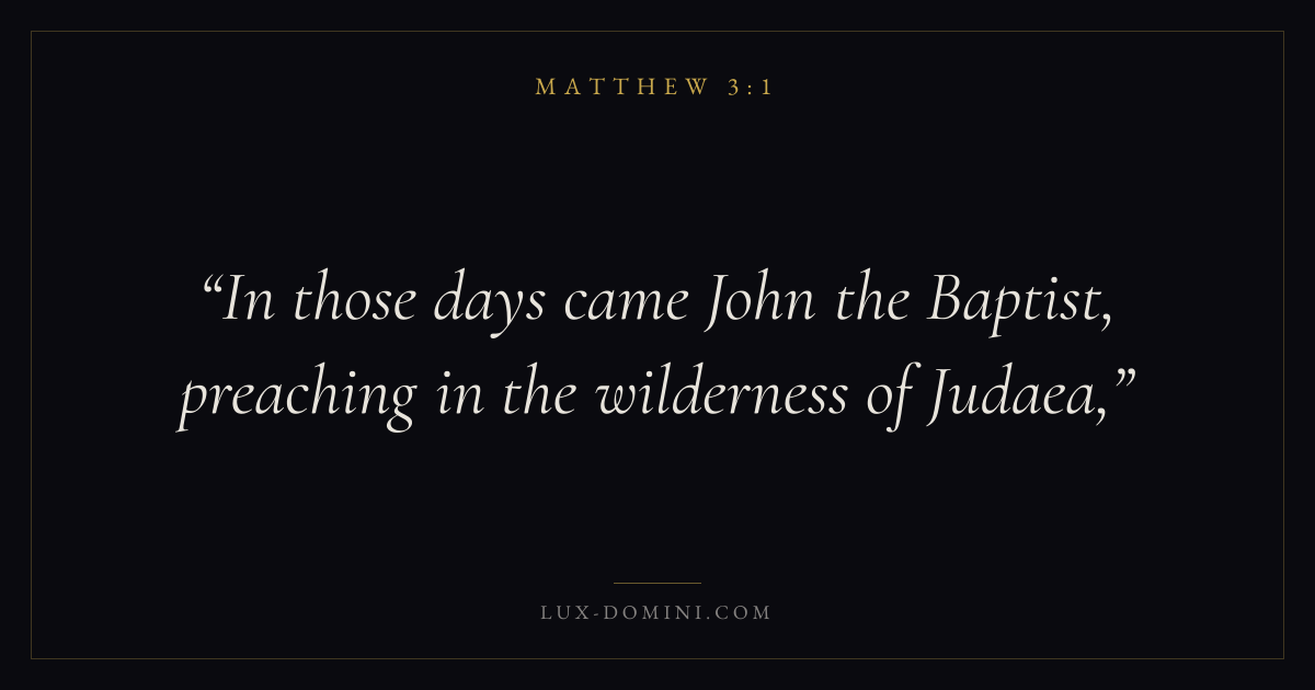 Books / Matthew / Chapter 3 / Verse 1 ← Matthew 2:23 Matthew 3:1 Matthew 3:2 → In those days came John the Baptist, preaching in the wilderness of Judaea, Download verse card Share on Twitter Share on Facebook Pin it ✦ Key themes FulfillmentKingdom of heavenDiscipleshipTeaching Read with Matthew 3:2Matthew 3:3 Glossary John Person (1. ) One who, with Annas and Caiaphas, sat in judgment on the apostles Peter and John ( Acts 4:6 ). He was of the kindred of the high priest; otherwise unknown. (2. ) The Hebrew name of Mark (q. v. ). Judea Place Biblical region. Modern identification: Jerusalem. ✦ Matthew Chapter 3 verses V. 1 V. 2 V. 3 V. 4 V. 5 V. 6 V. 7 V. 8 V. 9 V. 10 V. 11 V. 12 V. 13 V. 14 V. 15 V. 16 V. 17