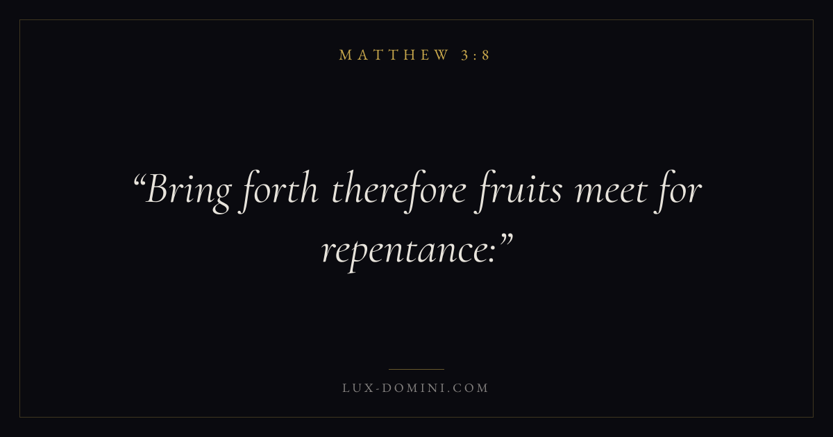 Books / Matthew / Chapter 3 / Verse 8 ← Matthew 3:7 Matthew 3:8 Matthew 3:9 → Bring forth therefore fruits meet for repentance: Download verse card Share on Twitter Share on Facebook Pin it ✦ Key themes FulfillmentKingdom of heavenDiscipleshipTeaching Read with Matthew 3:7Matthew 3:9 ✦ Matthew Chapter 3 verses V. 1 V. 2 V. 3 V. 4 V. 5 V. 6 V. 7 V. 8 V. 9 V. 10 V. 11 V. 12 V. 13 V. 14 V. 15 V. 16 V. 17