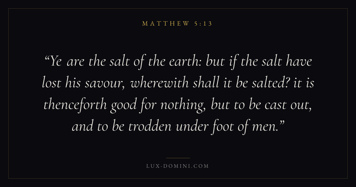 Ye are the salt of the earth: but if the salt have lost his savour, wherewith shall it be salted? it is thenceforth good for nothing, but to be cast out, and to be trodden under foot of men.