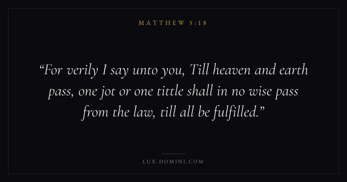 For verily I say unto you, Till heaven and earth pass, one jot or one tittle shall in no wise pass from the law, till all be fulfilled.