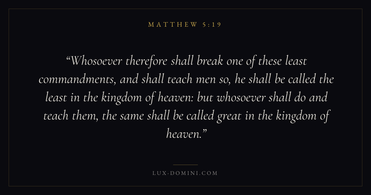 Whosoever therefore shall break one of these least commandments, and shall teach men so, he shall be called the least in the kingdom of heaven: but whosoever shall do and teach them, the same shall be called great in the kingdom of heaven.