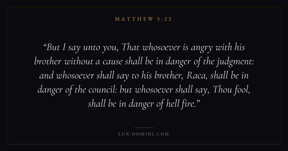 But I say unto you, That whosoever is angry with his brother without a cause shall be in danger of the judgment: and whosoever shall say to his brother, Raca, shall be in danger of the council: but whosoever shall say, Thou fool, shall be in danger of hell fire.