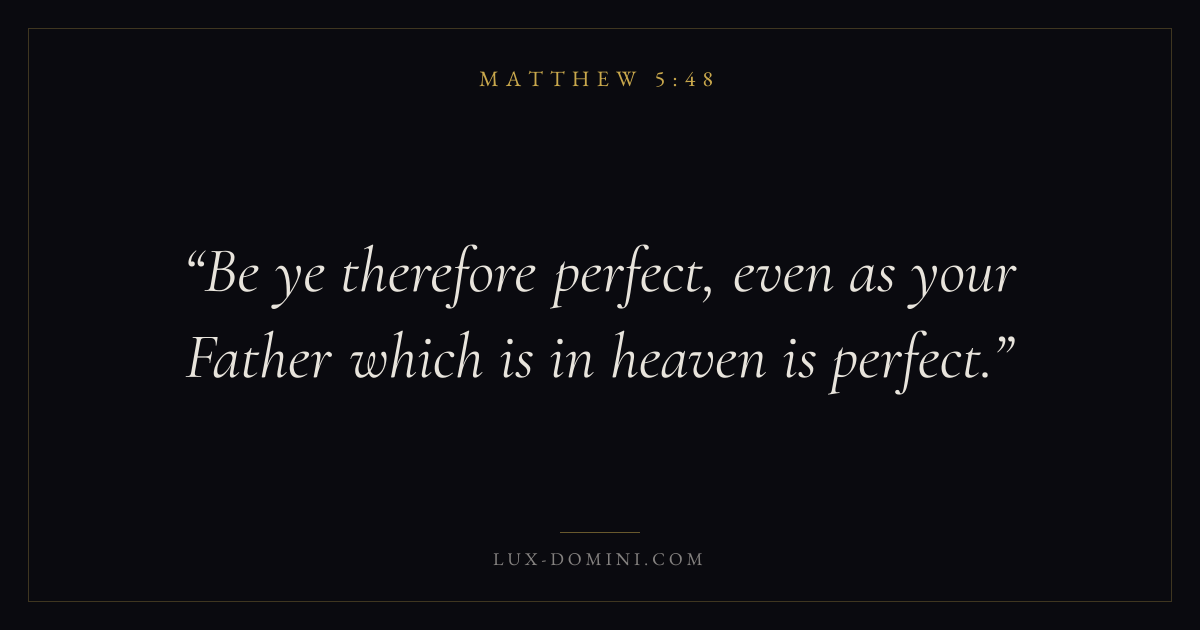 Books / Matthew / Chapter 5 / Verse 48 ← Matthew 5:47 Matthew 5:48 Matthew 6:1 → Be ye therefore perfect, even as your Father which is in heaven is perfect. Download verse card Share on Twitter Share on Facebook Pin it ✦ Key themes FulfillmentKingdom of heavenDiscipleshipTeaching ✦ Matthew Chapter 5 verses V. 1 V. 2 V. 3 V. 4 V. 5 V. 6 V. 7 V. 8 V. 9 V. 10 V. 11 V. 12 V. 13 V. 14 V. 15 V. 16 V. 17 V. 18 V. 19 V. 20 V. 21 V. 22 V. 23 V. 24 V. 25 V. 26 V. 27 V. 28 V. 29 V. 30 V. 31 V. 32 V. 33 V. 34 V. 35 V. 36 V. 37 V. 38 V. 39 V. 40 V. 41 V. 42 V. 43 V. 44 V. 45 V. 46 V. 47 V. 48