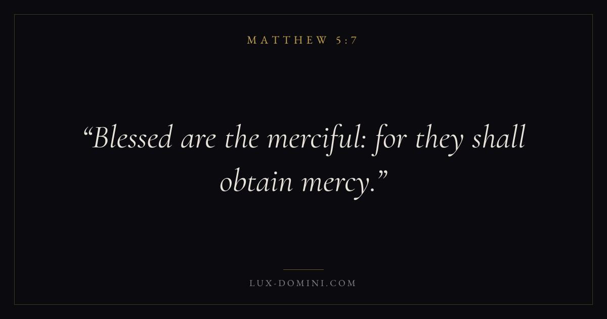 Books / Matthew / Chapter 5 / Verse 7 ← Matthew 5:6 Matthew 5:7 Matthew 5:8 → Blessed are the merciful: for they shall obtain mercy. Download verse card Share on Twitter Share on Facebook Pin it ✦ Key themes Justice and mercyFulfillmentKingdom of heavenDiscipleship Read with Matthew 5:6Micah 6:8Amos 5:24 Related topics Bible verses about justice and mercy ✦ Matthew Chapter 5 verses V. 1 V. 2 V. 3 V. 4 V. 5 V. 6 V. 7 V. 8 V. 9 V. 10 V. 11 V. 12 V. 13 V. 14 V. 15 V. 16 V. 17 V. 18 V. 19 V. 20 V. 21 V. 22 V. 23 V. 24 V. 25 V. 26 V. 27 V. 28 V. 29 V. 30 V. 31 V. 32 V. 33 V. 34 V. 35 V. 36 V. 37 V. 38 V. 39 V. 40 V. 41 V. 42 V. 43 V. 44 V. 45 V. 46 V. 47 V. 48