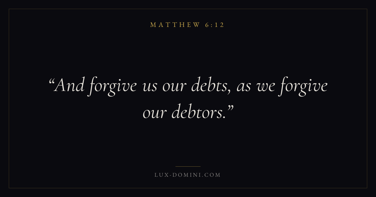 Books / Matthew / Chapter 6 / Verse 12 ← Matthew 6:11 Matthew 6:12 Matthew 6:13 → And forgive us our debts, as we forgive our debtors. Download verse card Share on Twitter Share on Facebook Pin it ✦ Key themes PrayerForgivenessFulfillmentKingdom of heaven Read with Matthew 6:11Matthew 6:13Matthew 6:9Luke 18:1 Related topics Bible verses about prayerBible verses about forgiveness ✦ Matthew Chapter 6 verses V. 1 V. 2 V. 3 V. 4 V. 5 V. 6 V. 7 V. 8 V. 9 V. 10 V. 11 V. 12 V. 13 V. 14 V. 15 V. 16 V. 17 V. 18 V. 19 V. 20 V. 21 V. 22 V. 23 V. 24 V. 25 V. 26 V. 27 V. 28 V. 29 V. 30 V. 31 V. 32 V. 33 V. 34