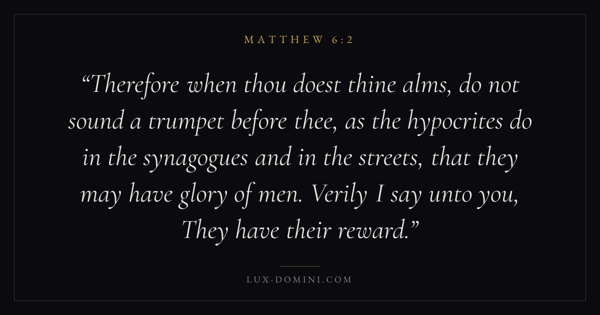 Therefore when thou doest thine alms, do not sound a trumpet before thee, as the hypocrites do in the synagogues and in the streets, that they may have glory of men. Verily I say unto you, They have their reward.