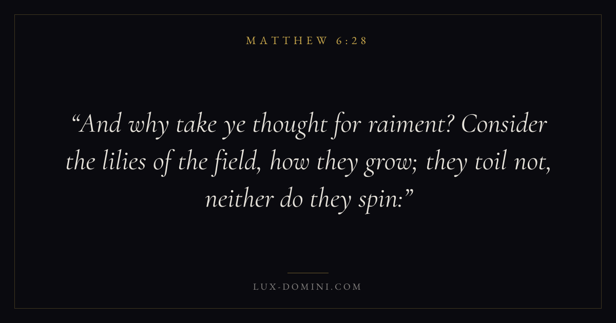And why take ye thought for raiment? Consider the lilies of the field, how they grow; they toil not, neither do they spin: