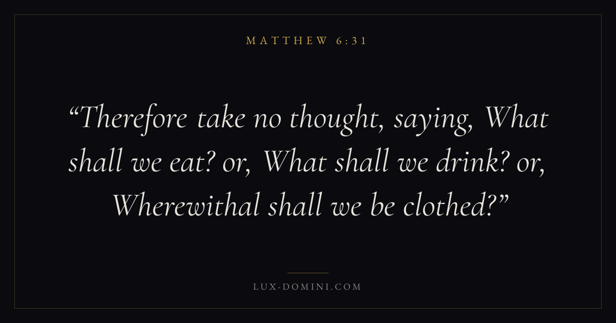 Therefore take no thought, saying, What shall we eat? or, What shall we drink? or, Wherewithal shall we be clothed?