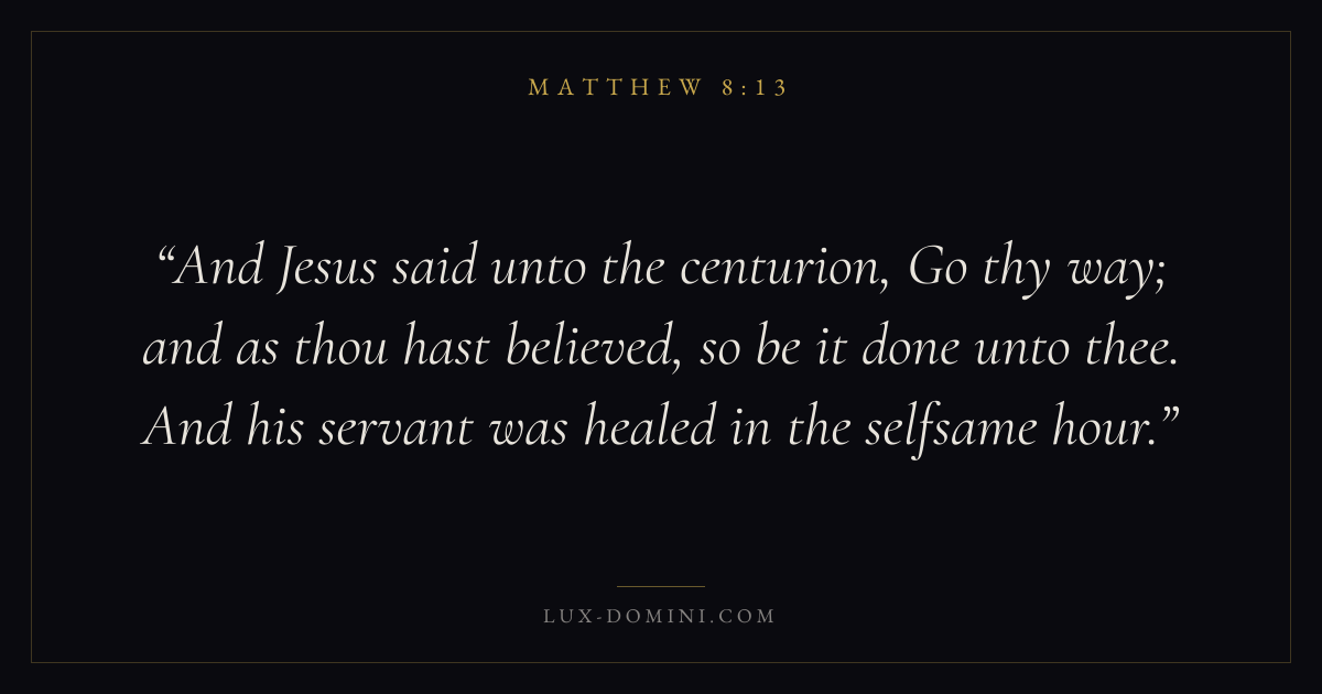 And Jesus said unto the centurion, Go thy way; and as thou hast believed, so be it done unto thee. And his servant was healed in the selfsame hour.