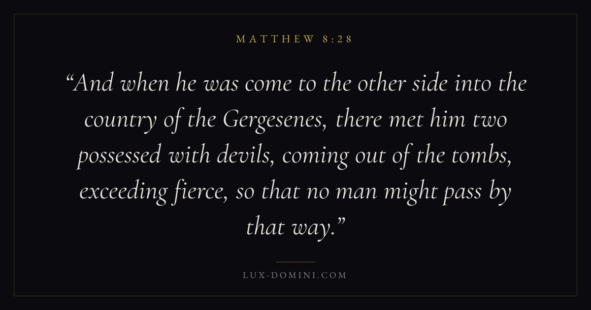 And when he was come to the other side into the country of the Gergesenes, there met him two possessed with devils, coming out of the tombs, exceeding fierce, so that no man might pass by that way.