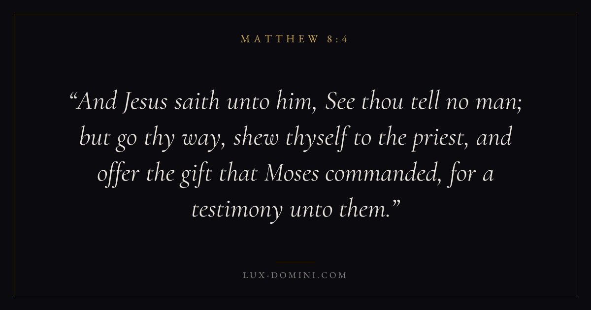 And Jesus saith unto him, See thou tell no man; but go thy way, shew thyself to the priest, and offer the gift that Moses commanded, for a testimony unto them.