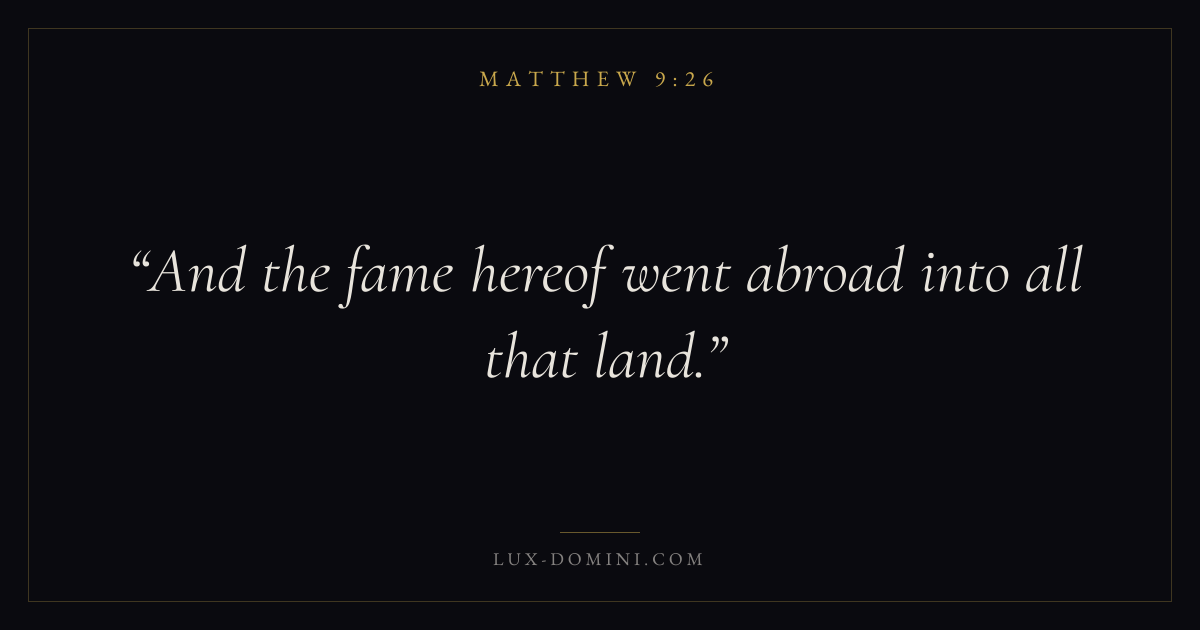 Books / Matthew / Chapter 9 / Verse 26 ← Matthew 9:25 Matthew 9:26 Matthew 9:27 → And the fame hereof went abroad into all that land. Download verse card Share on Twitter Share on Facebook Pin it ✦ Key themes Justice and mercyFulfillmentKingdom of heavenDiscipleship Read with Matthew 9:25Micah 6:8Amos 5:24 Related topics Bible verses about justice and mercy ✦ Matthew Chapter 9 verses V. 1 V. 2 V. 3 V. 4 V. 5 V. 6 V. 7 V. 8 V. 9 V. 10 V. 11 V. 12 V. 13 V. 14 V. 15 V. 16 V. 17 V. 18 V. 19 V. 20 V. 21 V. 22 V. 23 V. 24 V. 25 V. 26 V. 27 V. 28 V. 29 V. 30 V. 31 V. 32 V. 33 V. 34 V. 35 V. 36 V. 37 V. 38