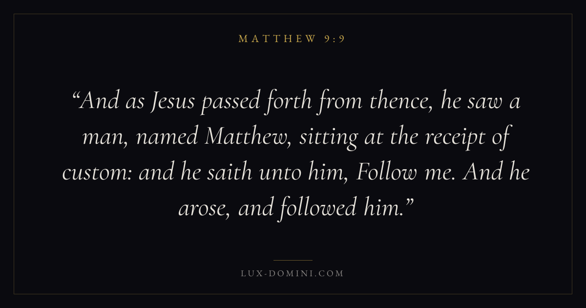 And as Jesus passed forth from thence, he saw a man, named Matthew, sitting at the receipt of custom: and he saith unto him, Follow me. And he arose, and followed him.