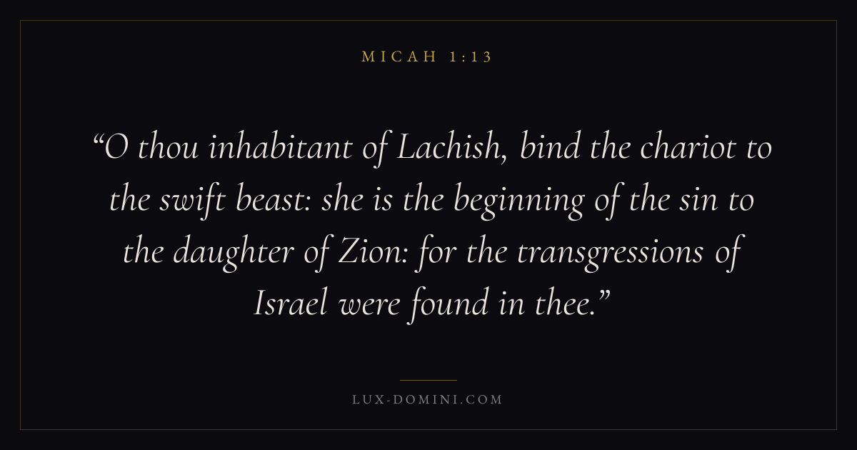 O thou inhabitant of Lachish, bind the chariot to the swift beast: she is the beginning of the sin to the daughter of Zion: for the transgressions of Israel were found in thee.