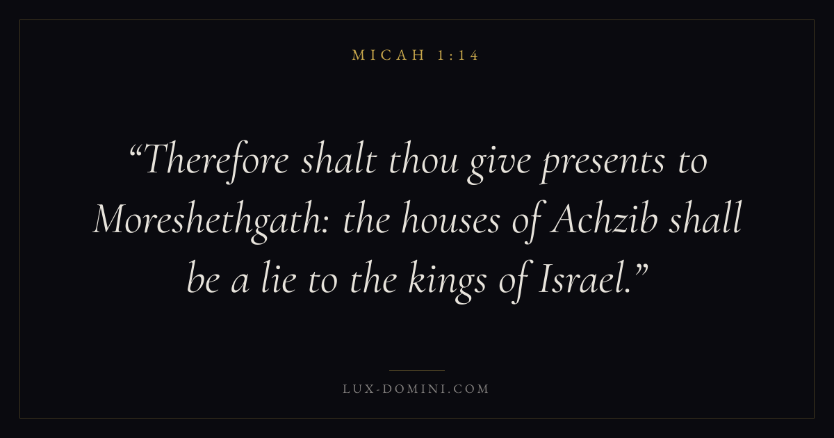 Therefore shalt thou give presents to Moreshethgath: the houses of Achzib shall be a lie to the kings of Israel.