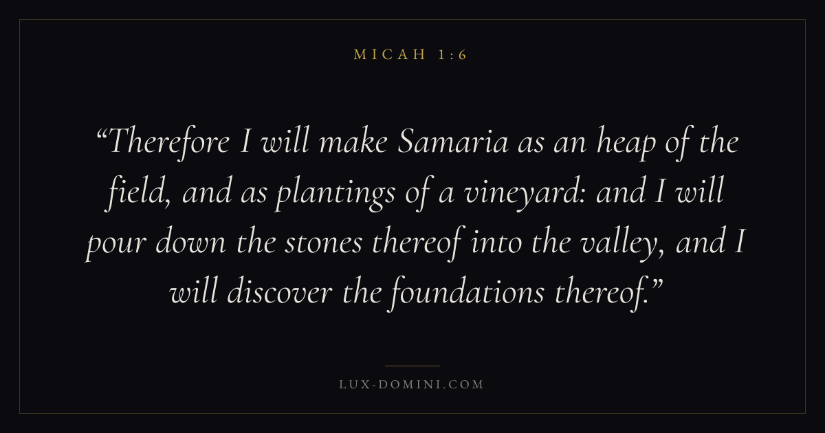 Therefore I will make Samaria as an heap of the field, and as plantings of a vineyard: and I will pour down the stones thereof into the valley, and I will discover the foundations thereof.