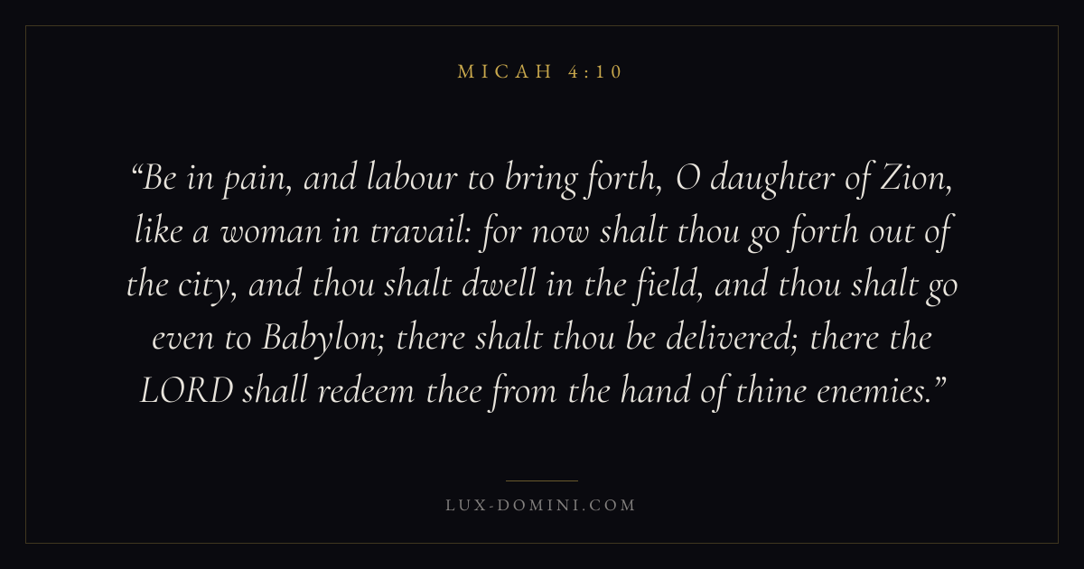 Be in pain, and labour to bring forth, O daughter of Zion, like a woman in travail: for now shalt thou go forth out of the city, and thou shalt dwell in the field, and thou shalt go even to Babylon; there shalt thou be delivered; there the LORD shall redeem thee from the hand of thine enemies.
