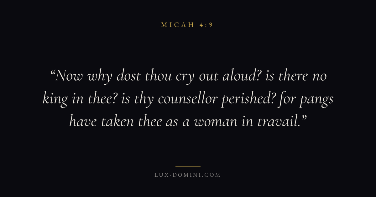 Now why dost thou cry out aloud? is there no king in thee? is thy counsellor perished? for pangs have taken thee as a woman in travail.
