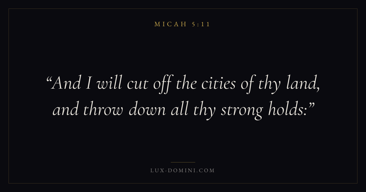 Books / Micah / Chapter 5 / Verse 11 ← Micah 5:10 Micah 5:11 Micah 5:12 → And I will cut off the cities of thy land, and throw down all thy strong holds: Download verse card Share on Twitter Share on Facebook Pin it ✦ Key themes HopeAnxiety and fearJustice and mercySalvationJustice Read with Micah 5:9Micah 5:10Romans 8:24Revelation 21:4 Related topics Bible verses about hopeBible verses about anxiety and fearBible verses about justice and mercyBible verses about salvation ✦ Micah Chapter 5 verses V. 1 V. 2 V. 3 V. 4 V. 5 V. 6 V. 7 V. 8 V. 9 V. 10 V. 11 V. 12 V. 13 V. 14 V. 15