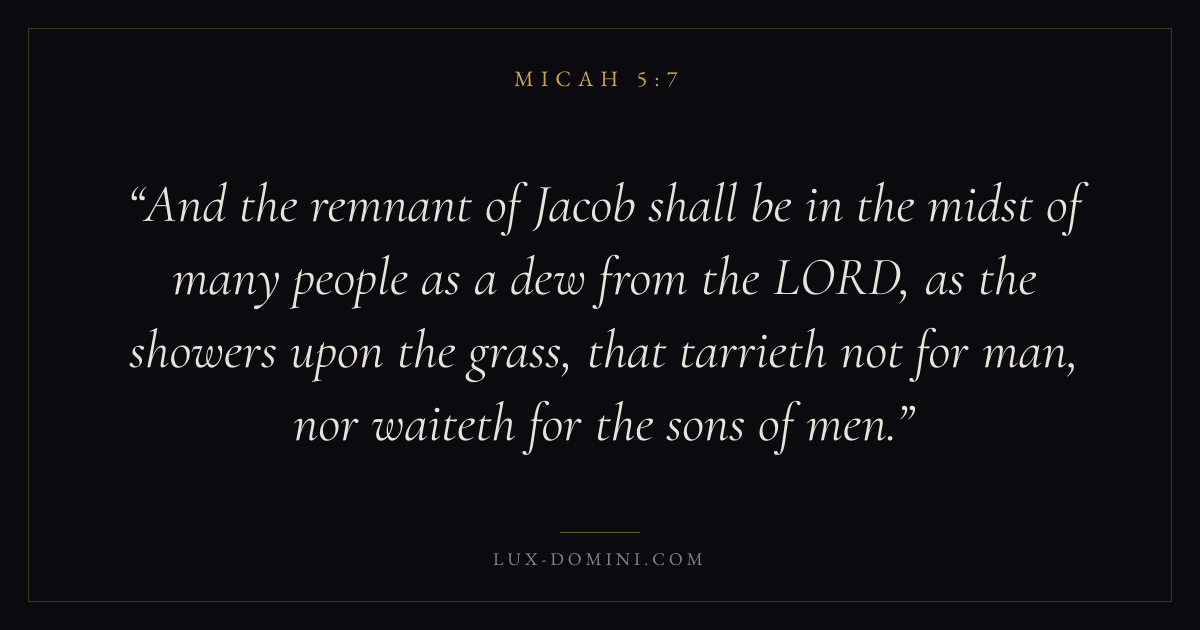 And the remnant of Jacob shall be in the midst of many people as a dew from the LORD, as the showers upon the grass, that tarrieth not for man, nor waiteth for the sons of men.