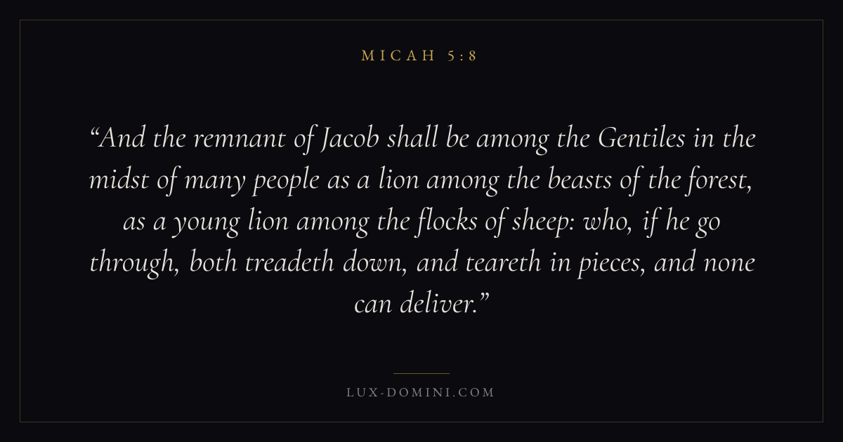 And the remnant of Jacob shall be among the Gentiles in the midst of many people as a lion among the beasts of the forest, as a young lion among the flocks of sheep: who, if he go through, both treadeth down, and teareth in pieces, and none can deliver.
