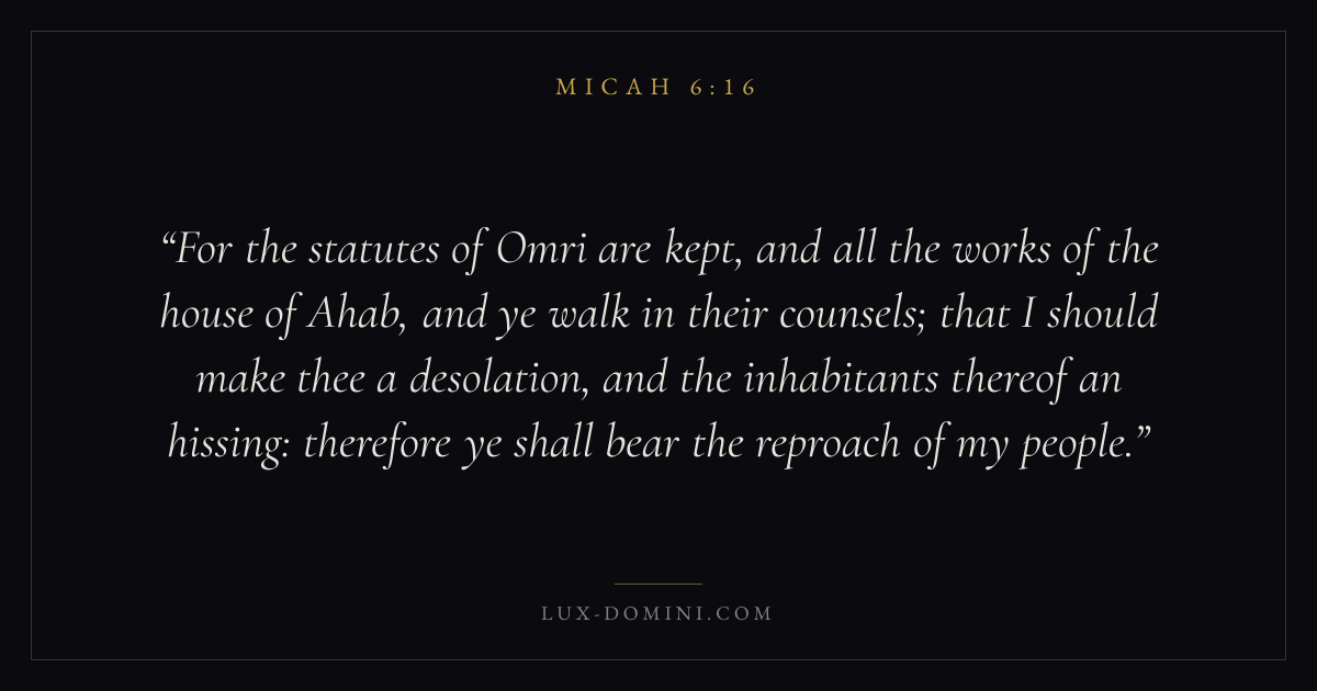 For the statutes of Omri are kept, and all the works of the house of Ahab, and ye walk in their counsels; that I should make thee a desolation, and the inhabitants thereof an hissing: therefore ye shall bear the reproach of my people.