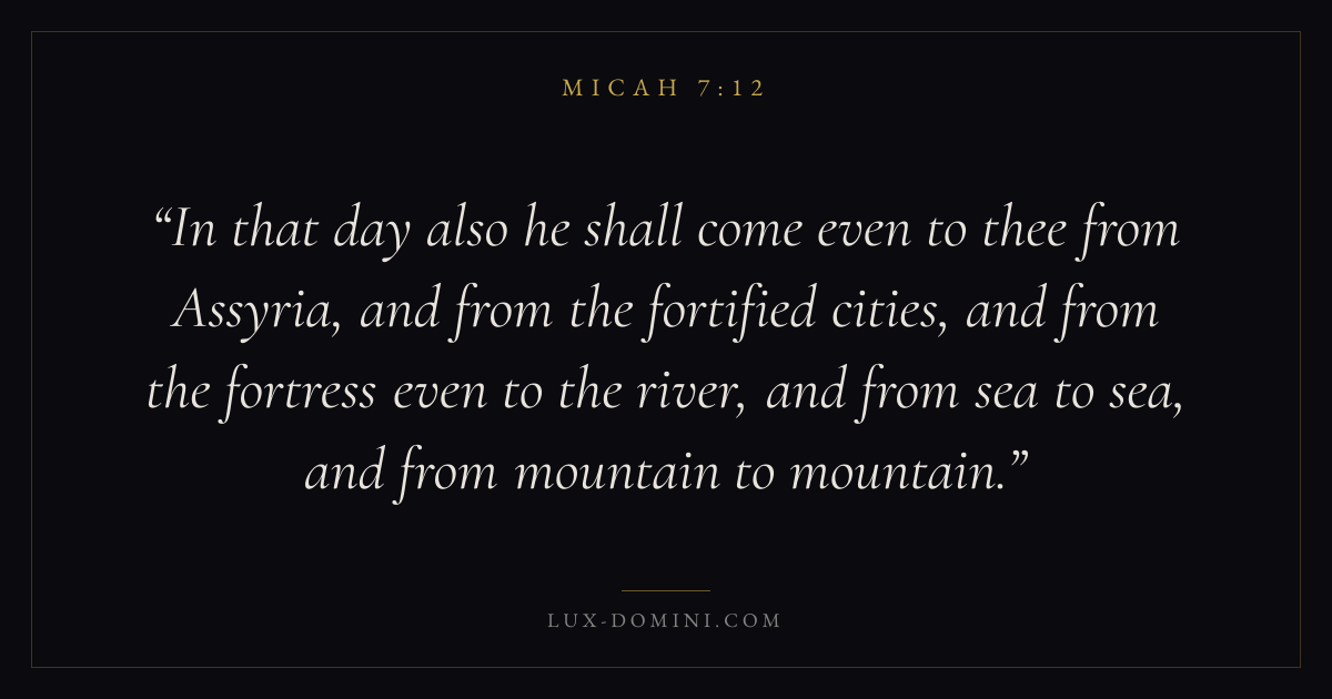 In that day also he shall come even to thee from Assyria, and from the fortified cities, and from the fortress even to the river, and from sea to sea, and from mountain to mountain.