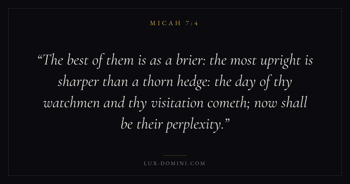 The best of them is as a brier: the most upright is sharper than a thorn hedge: the day of thy watchmen and thy visitation cometh; now shall be their perplexity.