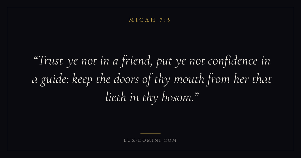 Trust ye not in a friend, put ye not confidence in a guide: keep the doors of thy mouth from her that lieth in thy bosom.