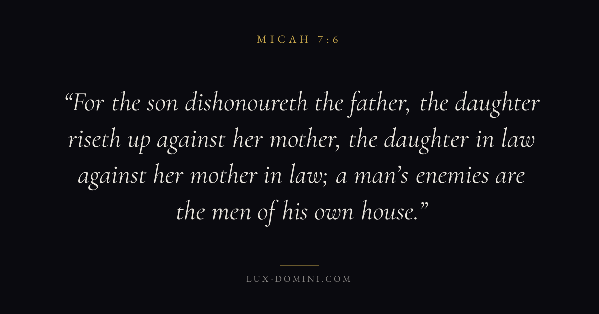 For the son dishonoureth the father, the daughter riseth up against her mother, the daughter in law against her mother in law; a man’s enemies are the men of his own house.
