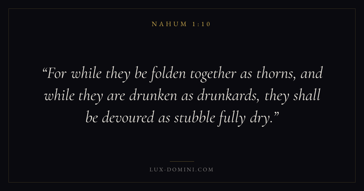 For while they be folden together as thorns, and while they are drunken as drunkards, they shall be devoured as stubble fully dry.