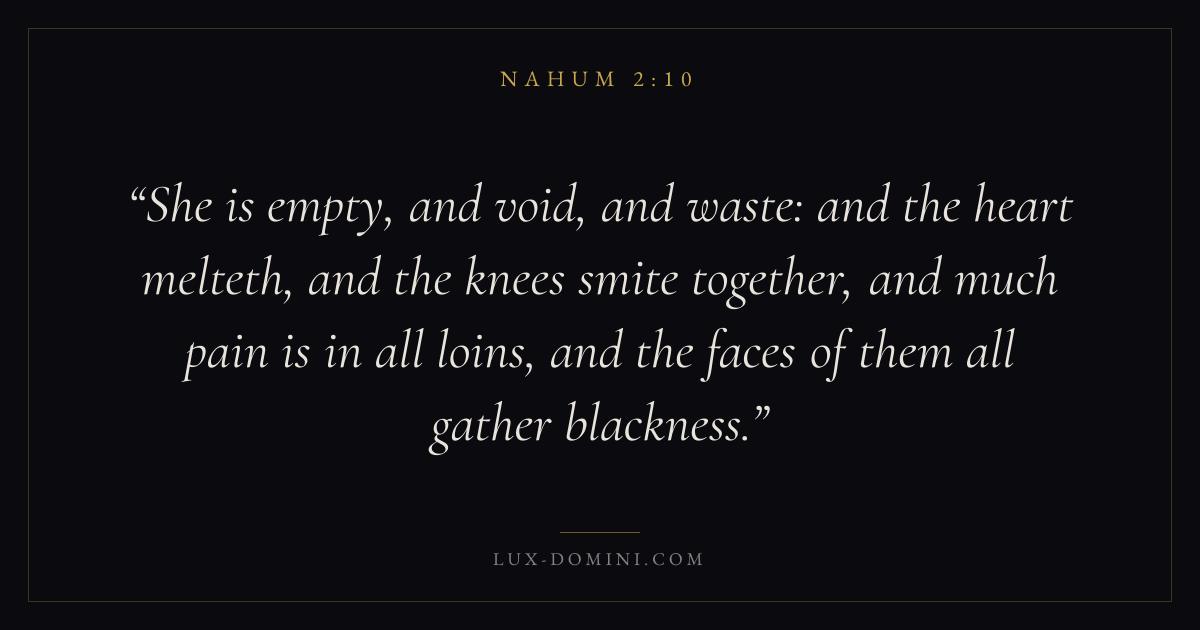 She is empty, and void, and waste: and the heart melteth, and the knees smite together, and much pain is in all loins, and the faces of them all gather blackness.