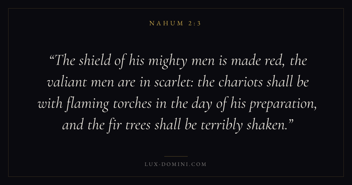 The shield of his mighty men is made red, the valiant men are in scarlet: the chariots shall be with flaming torches in the day of his preparation, and the fir trees shall be terribly shaken.