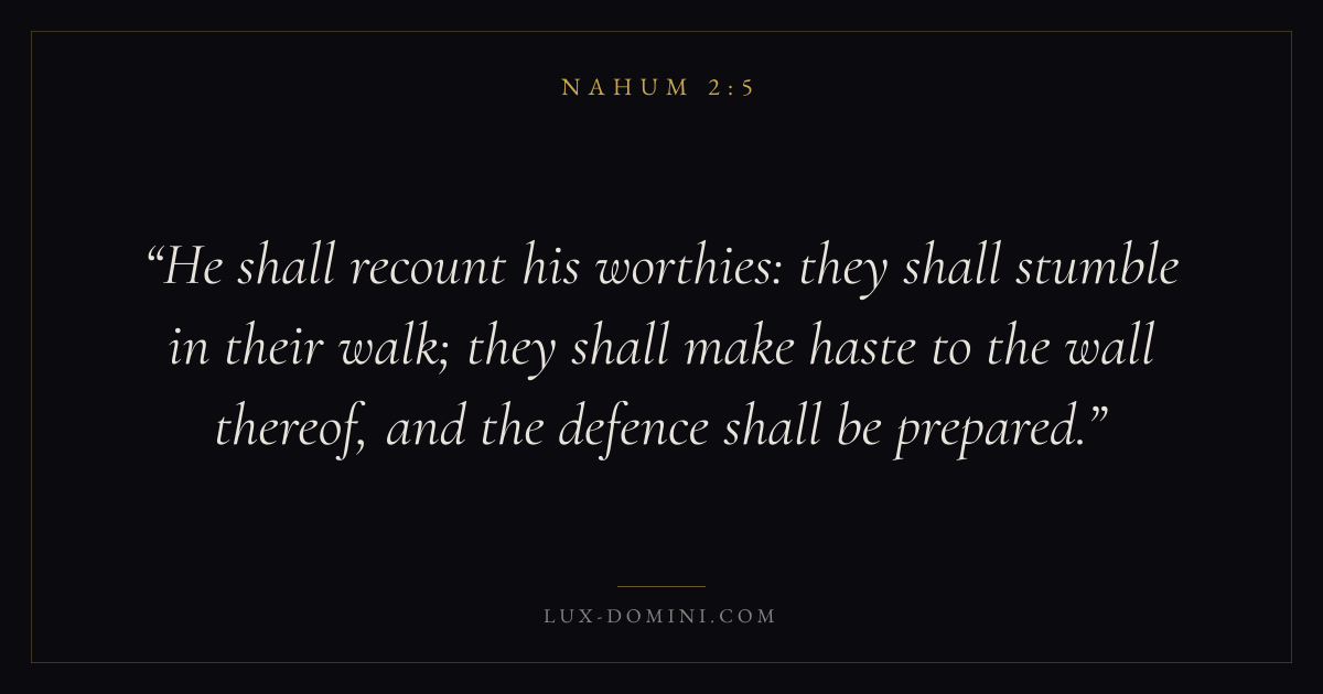 He shall recount his worthies: they shall stumble in their walk; they shall make haste to the wall thereof, and the defence shall be prepared.