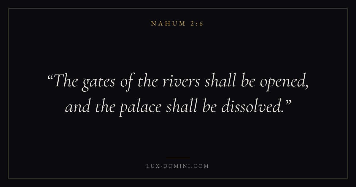 Books / Nahum / Chapter 2 / Verse 6 ← Nahum 2:5 Nahum 2:6 Nahum 2:7 → The gates of the rivers shall be opened, and the palace shall be dissolved. Download verse card Share on Twitter Share on Facebook Pin it ✦ Key themes Justice and mercyHumilityJudgmentEmpire Read with Nahum 2:7Nahum 2:8Micah 6:8Amos 5:24 Related topics Bible verses about justice and mercyBible verses about humility ✦ Nahum Chapter 2 verses V. 1 V. 2 V. 3 V. 4 V. 5 V. 6 V. 7 V. 8 V. 9 V. 10 V. 11 V. 12 V. 13