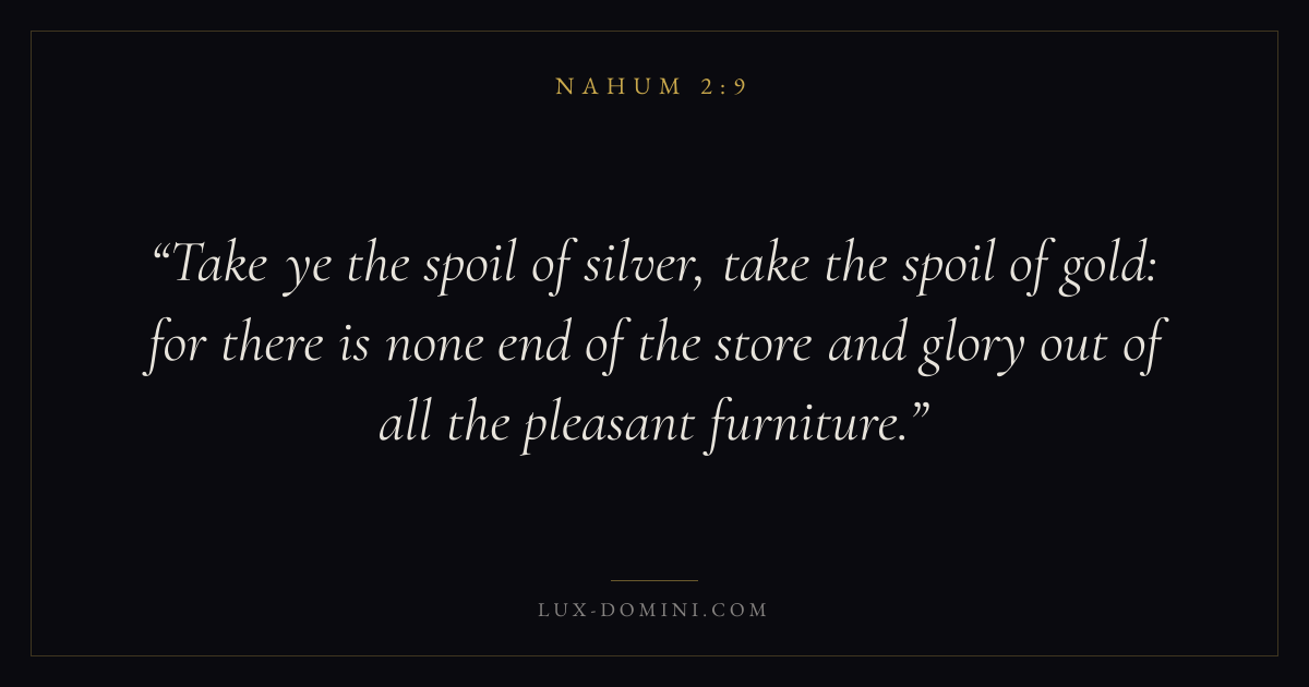 Take ye the spoil of silver, take the spoil of gold: for there is none end of the store and glory out of all the pleasant furniture.