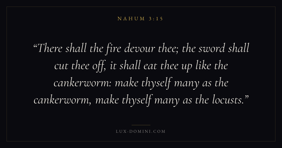 There shall the fire devour thee; the sword shall cut thee off, it shall eat thee up like the cankerworm: make thyself many as the cankerworm, make thyself many as the locusts.