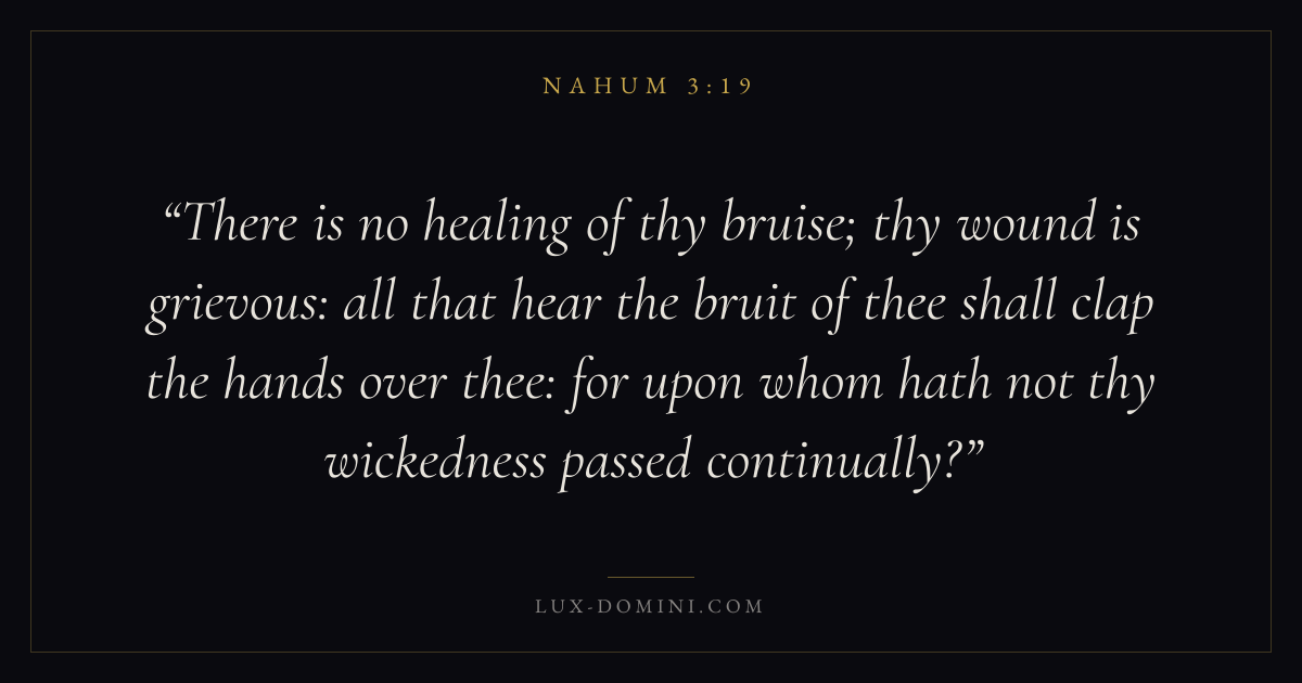 There is no healing of thy bruise; thy wound is grievous: all that hear the bruit of thee shall clap the hands over thee: for upon whom hath not thy wickedness passed continually?