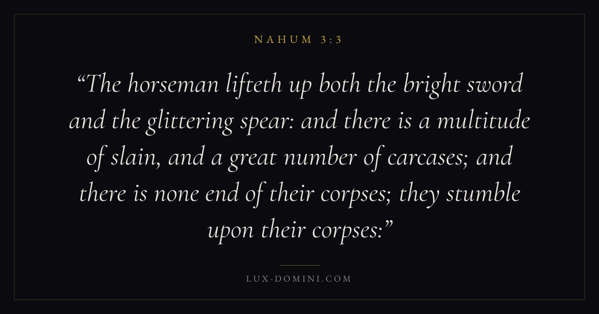 The horseman lifteth up both the bright sword and the glittering spear: and there is a multitude of slain, and a great number of carcases; and there is none end of their corpses; they stumble upon their corpses: