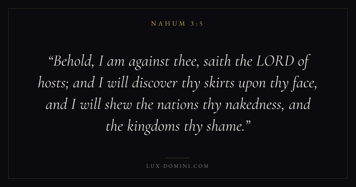 Behold, I am against thee, saith the LORD of hosts; and I will discover thy skirts upon thy face, and I will shew the nations thy nakedness, and the kingdoms thy shame.